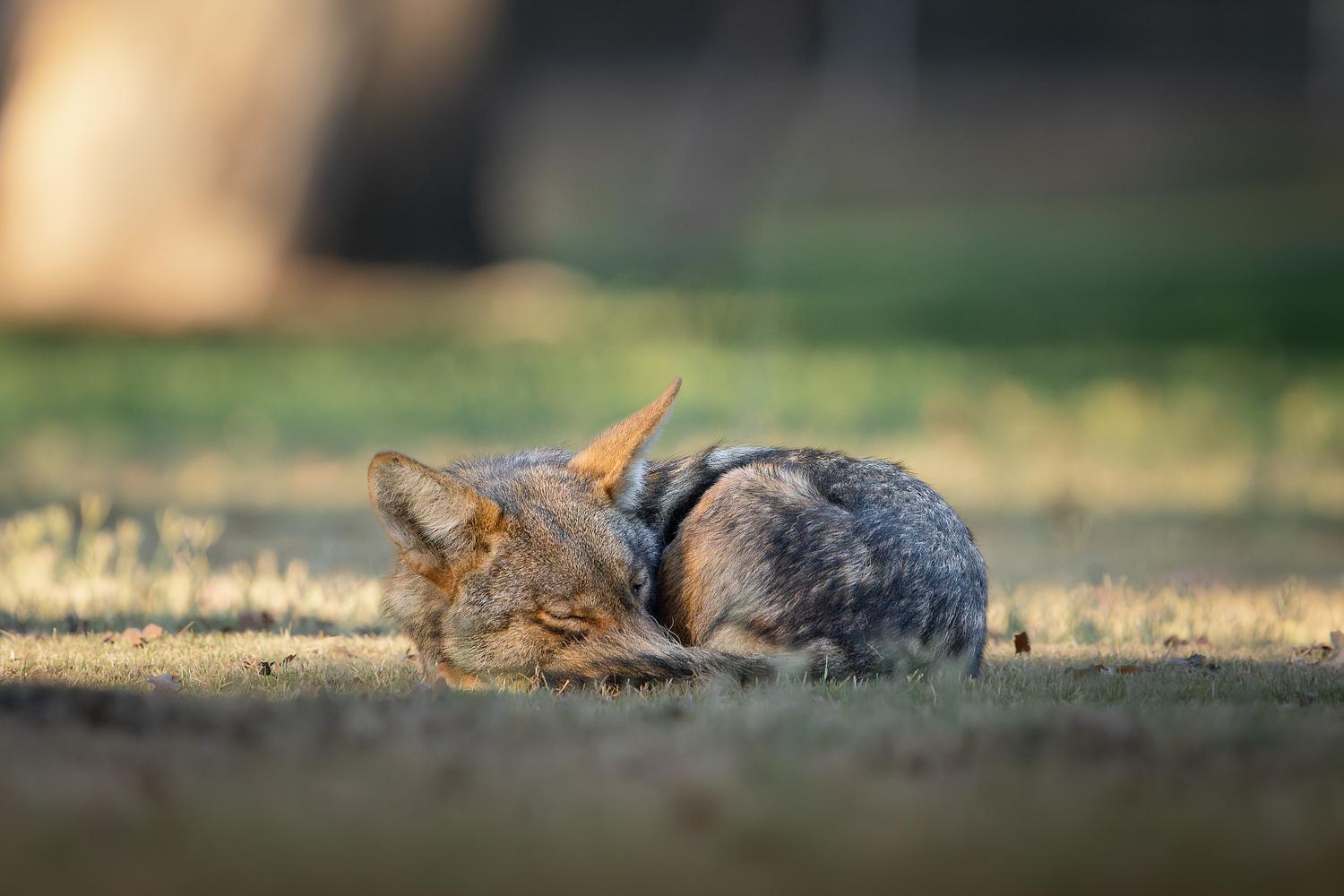 'Cozy Retreat' Coyote curled into a ball sleeping. 100% of the proceeds of this print will go to Project Coyote.
