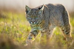 'Piercing Gaze' Bobcat strolling in a field. 100% of the proceeds of this print will go to Project Coyote.